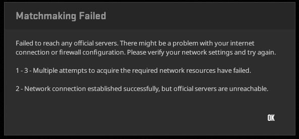 ❓: При начале поиска игры появляется ошибка "Matchmaking Failed" на всех или нескольких аккаунтах.